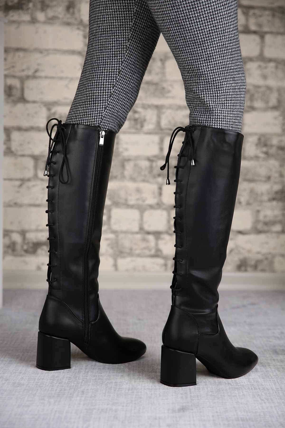 Bayan Arkadan Bağlamalı Topuklu Çizme SİYAH CİLT