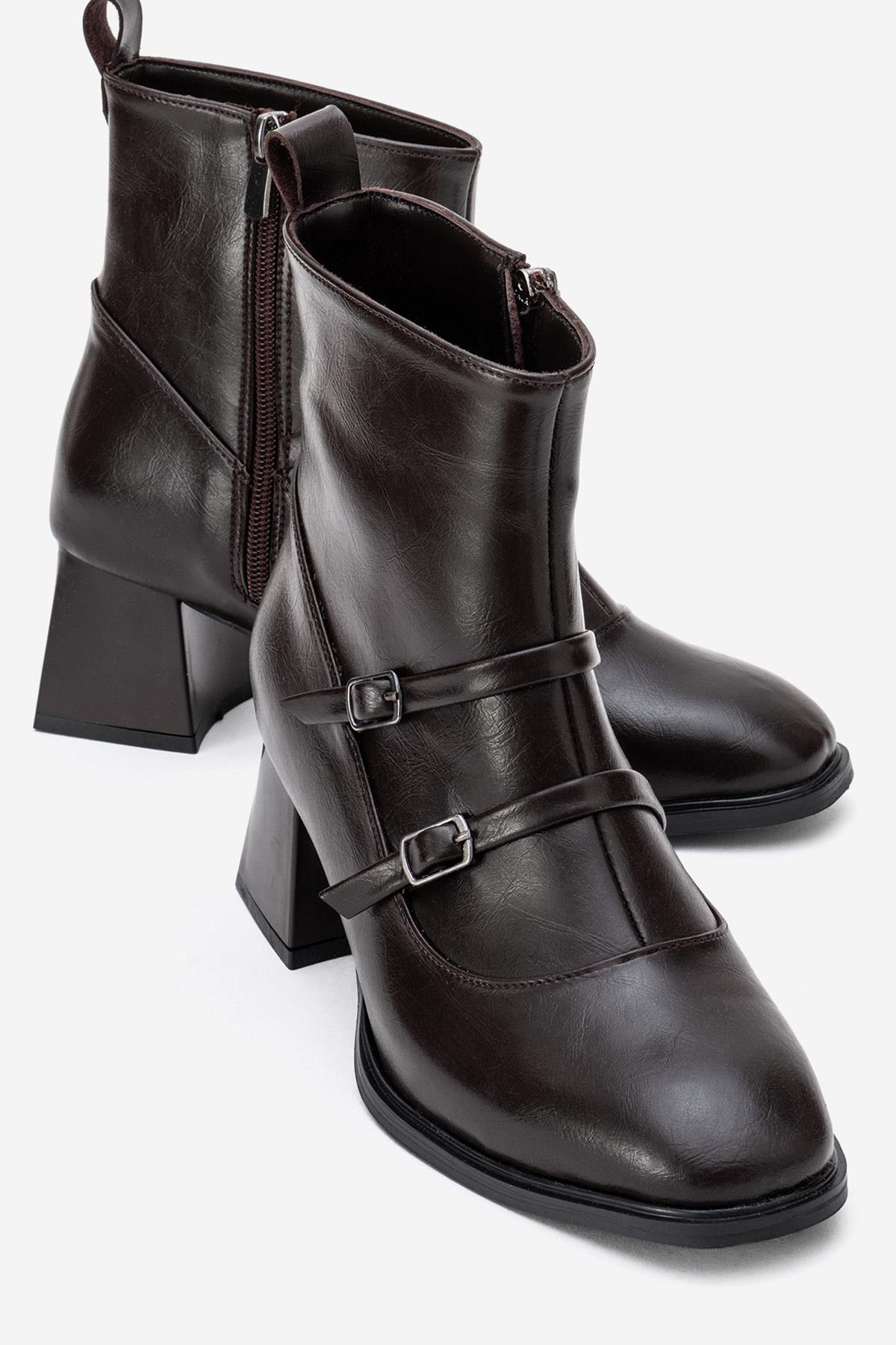 Sade Çift Tokalı Küt Burunlu Topuklu Bot KAHVE CİLT (Z35001400057 KAHVE CİLT)
